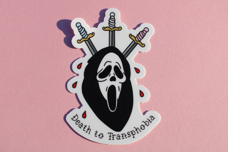 Pick up one of these "death to transphobia" stickers today if you are a true ghost face fan!